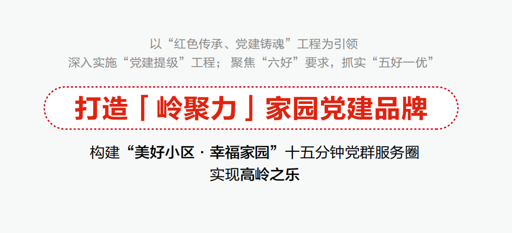 以“红色传承、党建铸魂”工程为引领深入实施“党建提级”工程; 聚焦“六好”要求,抓实“五好一优”打造「岭聚力」家园党建品牌构建“美好小区·幸福家园”十五分钟党群服务圈实现高岭之乐。