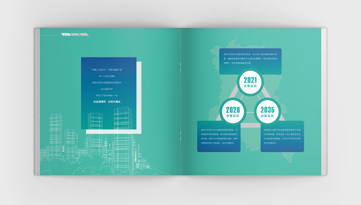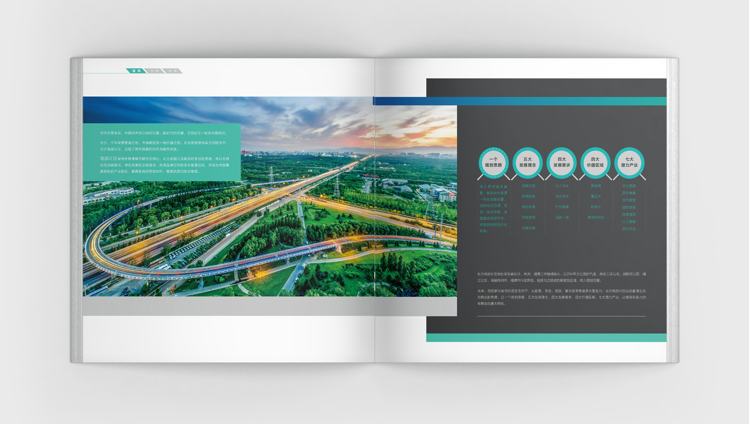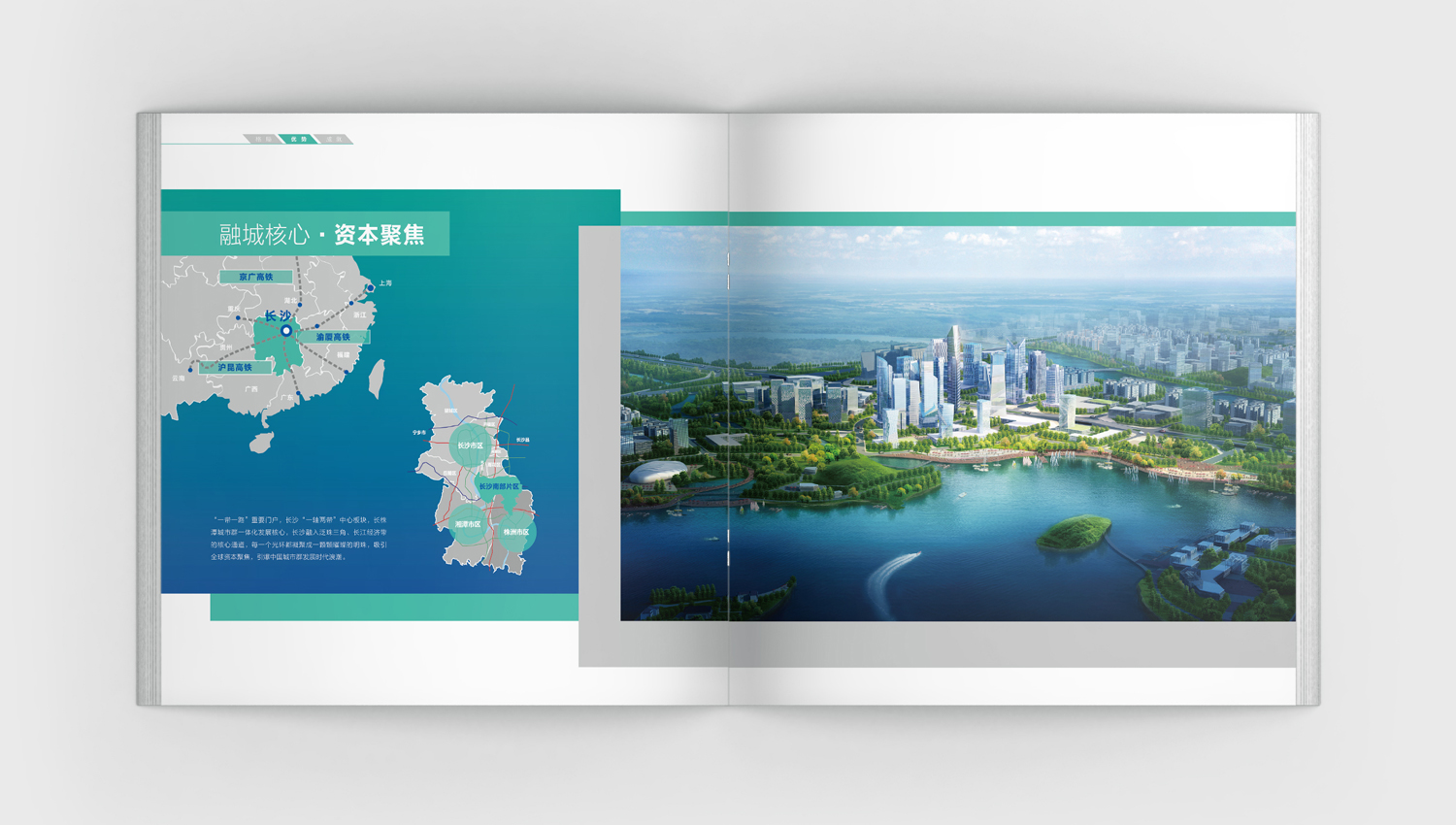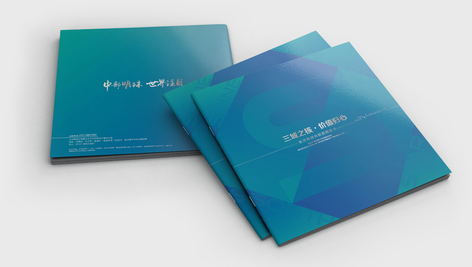 長沙南部片區位於“長沙南進、株洲、湘潭北上”的交會地,總用地面積約294平方公里,是長沙著力打造的“六大片區”之一。通過充分的了解,我們以“三城之核·價值歸心”為主題,對南部片區的整體規劃和完備配套進行了圖文並茂的詳細闡述和說明,並採用藍綠作為宣傳冊的主色調,體現了南部片區作為一個藍綠交織的生態智慧空間的品牌理性和對未來的希望。